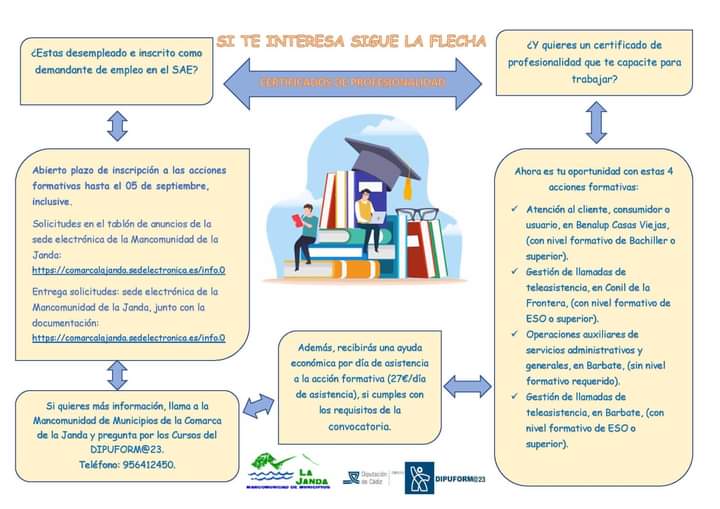 El alumnado percibirá una ayuda económica de 27 euros por día de asistencia a la acción formativa. El plazo de inscripción permanecerá abierto hasta el próximo 5 de septiembre de 2023. Las solicitudes se entregarán en la sede electrónica de la Mancomunidad de Municipios de la Janda.