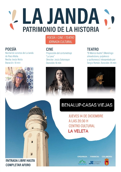 El Centro Cultural ‘La Veleta’ albergará este jueves 14 de diciembre a partir de las 20:30 horas la actividad ‘La Janda: Patrimonio de la historia’ que aúna poesía, cine y teatro. La entrada será gratuita hasta completar el aforo.