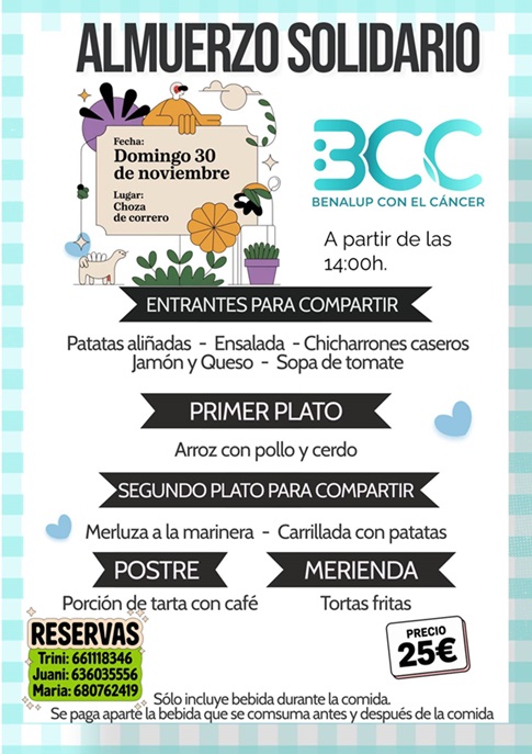 La Asociación ‘Benalup con el Cáncer’ ha organizado un almuerzo solidario para este domingo 30 de noviembre a partir de las 14:00 horas en la Choza de Correro. Con la puesta en marcha de esta actividad, la asociación busca recaudar fondos para seguir adelante con su importante labor social.