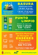 - La empresa concesionaria del servicio de limpieza, FCC, informa que desde el pasado 1 de abril se realizará la recogida diaria de basura sin interrupción hasta el día 30 de septiembre, es decir, todos los días de la semana. Se recuerda a los vecinos que el horario estipulado para el depósito de la basura en los contenedores es de 20:00 a 06:00 horas.